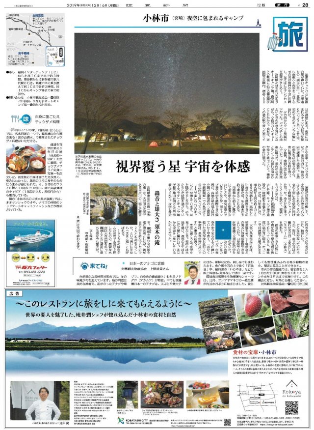 読売新聞編集企画「旅」では宮崎県小林市の魅力を紹介した。小林市は宮崎県北部に位置し豊かな自然と食材に恵まれた自治体。記事では夜空に包まれるキャンプ場、「小林市ひなもりオートキャンプ場」を取り上げた。キャンプ場では満天の星空はもちろん、その土地ならではの食材やお酒も楽しみの1つ。最近はソロキャンプも増えてきているという。冬場でも予約でいっぱいになることもある。