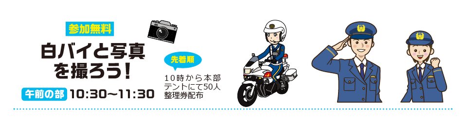 ・白バイ・ミニパトカー(AM10:00より本部テントにて50名様整理券配布)※撮影時間10:30~11:30